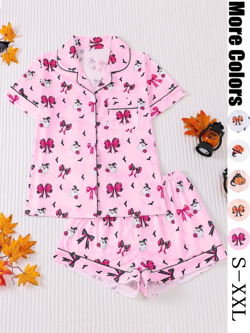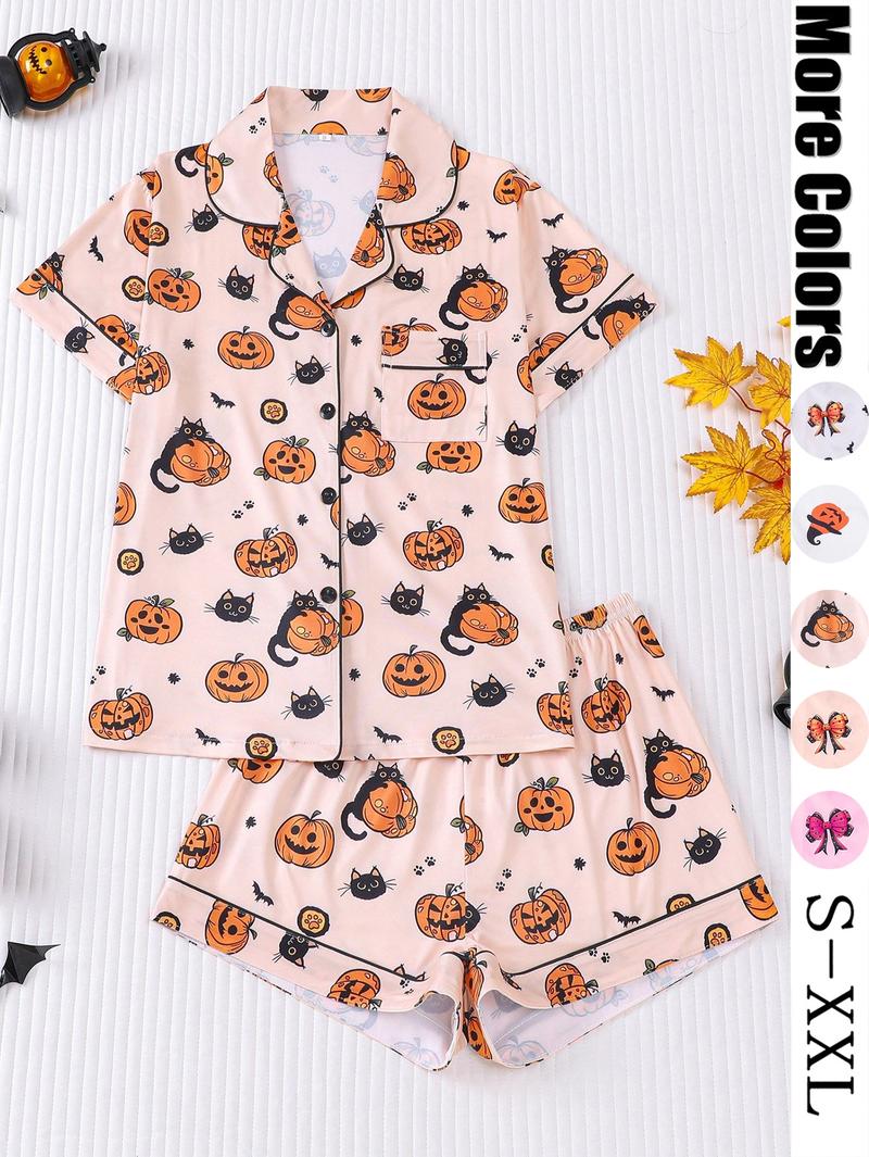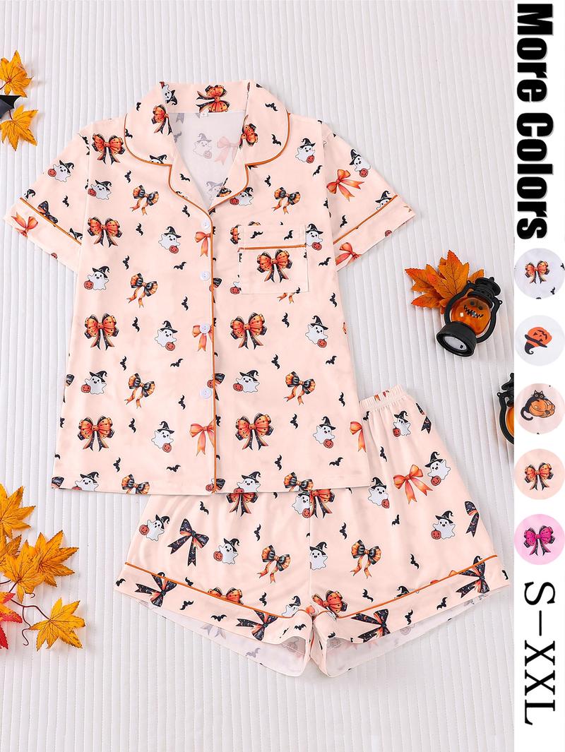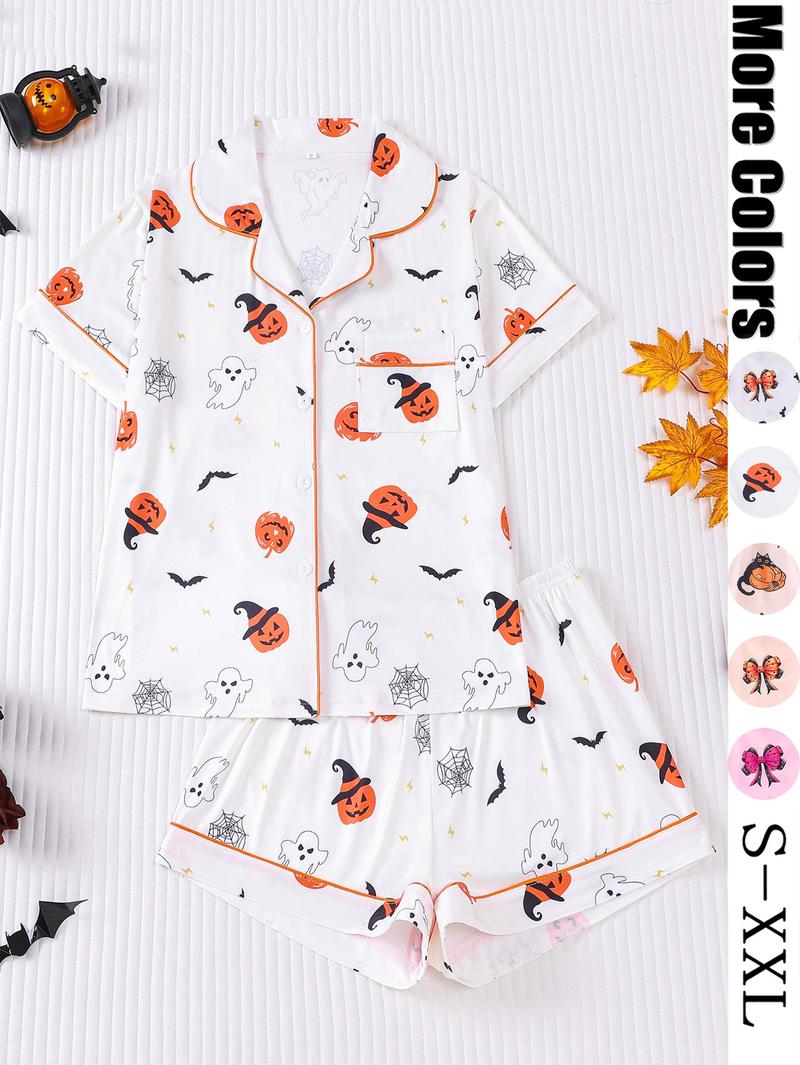 【Halloween】Women's Halloween Pajama Set, Cute Ghost Cat Pumpkin Print, Short Sleeve Lapel Shirt & Elastic Shorts, Casual All-Season Sleepwear, Loungewear