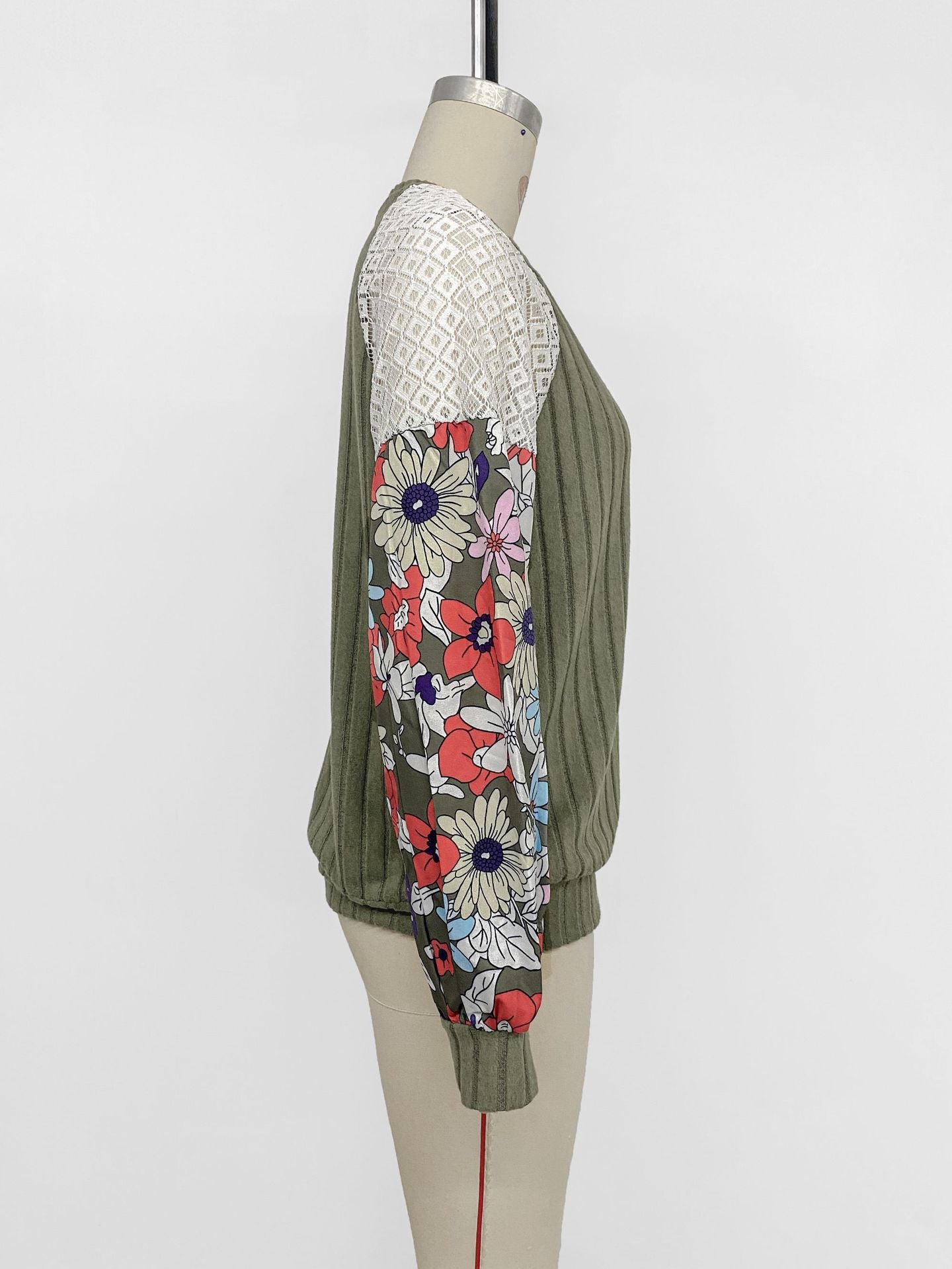 Elevate your wardrobe with our Floral Patchwork Long Sleeve Top. This Ribbed Blouse features a classic Crewneck design, accented with Striped Crochet Print and delicate Lace Knit detailing. Combining comfort and style, this top is perfect for any occasion, providing a sophisticated touch to any outfit.