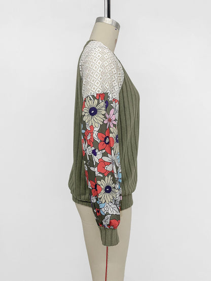 Floral Tops for Women Patchwork Long Sleeve Ribbed Blouses Crewneck Striped Crochet Print Shirts Lace Knit Sweaters