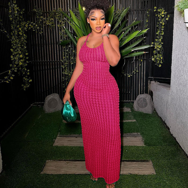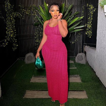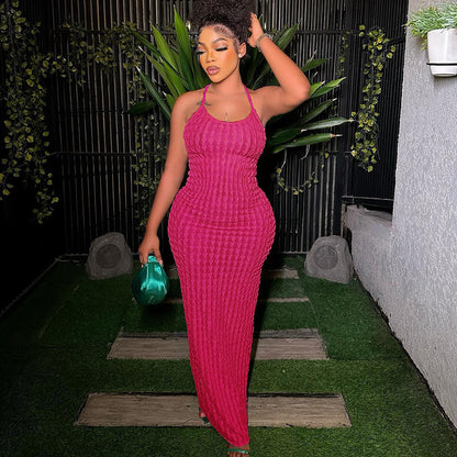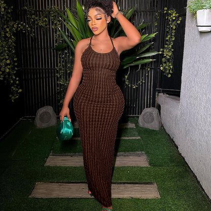 This women's solid backless cami dress features delicate frill trim and adjustable tie-back spaghetti straps, combining elegance with a flattering bodycon fit. Its sleeveless maxi design offers breathable comfort, making it ideal for summer outings, parties, or casual dates. Crafted for versatility, this dress transitions effortlessly from daytime wear to cocktail events, providing a stylish choice for vacation or club settings.